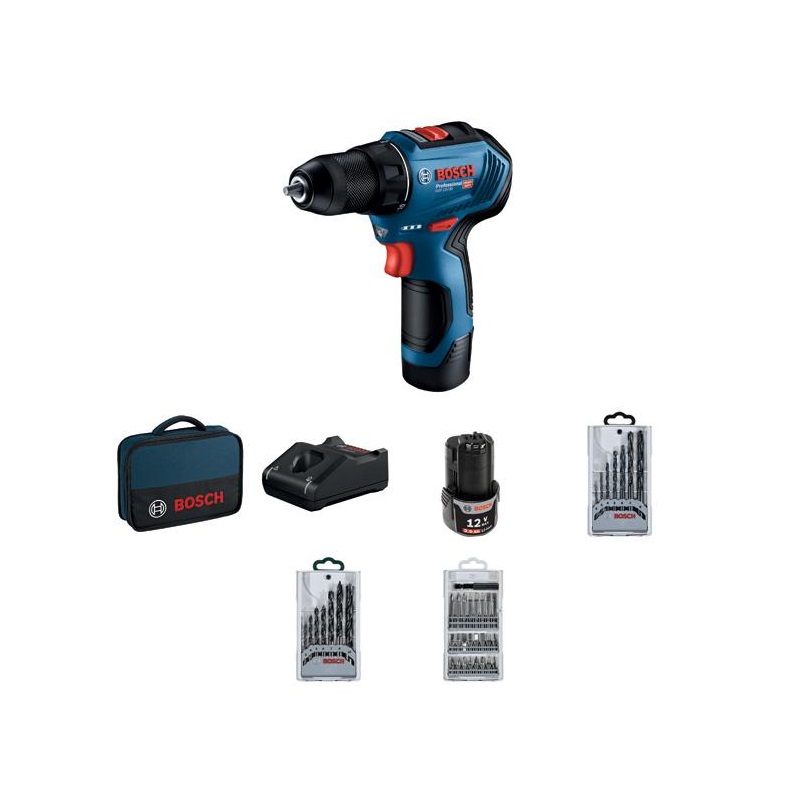 AKU BUŠILICA-ODVIJAČ BOSCH GSR 12V-30 + SET PRIBORA 39/1 + 2×12,0V 2.0AH + TORBA